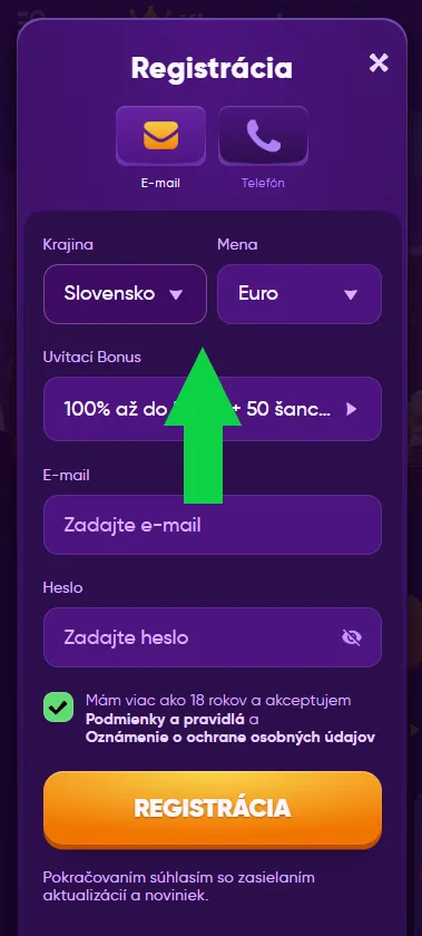 Spustite registráciu a vyberte si, či chcete aktivovať promo akciu pre online kasíno alebo pre športové stávky.